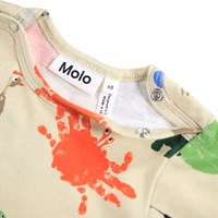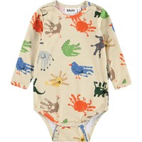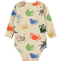 Beiger Langarm-Body für die Kleinen aus Öko-Baumwolle mit einem Druck von bunten Handabdrücken, die als Tiere gezeichnet sind. Der Body hat Bindeband und Knopfverschluss an den Schultern und zwischen den Beinen für einfaches An- und Ausziehen.