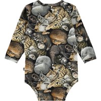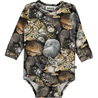 Foss ist ein Braun mit Aufdrucken verschiedener Tiere, die in den Winterschlaf gegangen sind und tief schlafen. Foss hat einen Druckknopf im Kragen und zwischen den Beinen, der das An- und Ausziehen des Bodys erleichtert.