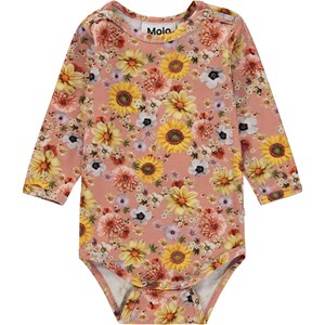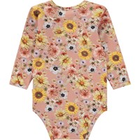 Rosa Baby-Body mit Allover-Blumendruck. Der Druck ist mit Blumen gefüllt, wie z.B. Sonnenblumen, Dahlien und Gänseblümchen. Dieser Body besteht aus 100% Baumwolle, hat lange Ärmel und Druckknöpfe am Kragen und zwischen den Beinen, die das An- und Ausziehen des Bodys erleichtern. Kombinieren Sie evt. diesen Body mit der Hose Stafanie im gleichen Aufdruck.