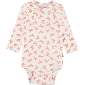 Foss ist ein weißer, langärmeliger Babybody mit pinkfarbenem Pferdeprint. Kombinieren Sie mit passenden Hosen. Druckknöpfe am Hals und zwischen den Beinen erleichtern das An- und Ausziehen des Bodys. Kombinieren Sie mit passenden Hosen.