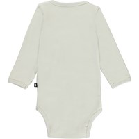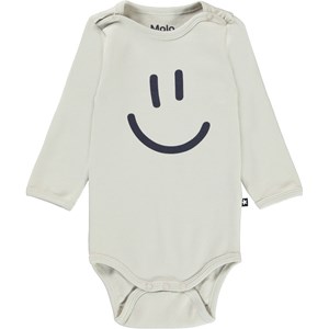Foss ist ein beiger Babybody mit Smiley-Print. Foss hat einen Druckknopf im Kragen und zwischen den Beinen, der das An- und Ausziehen des Bodys erleichtert.