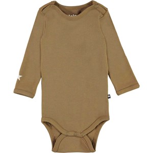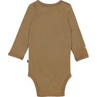 Foss ist ein langärmliger grün-brauner Babybody mit einem weißen Stern auf einem Ärmel. Druckknöpfe am Hals und zwischen den Beinen erleichtern das An- und Ausziehen des Bodys.
