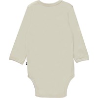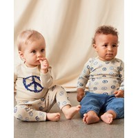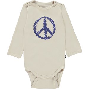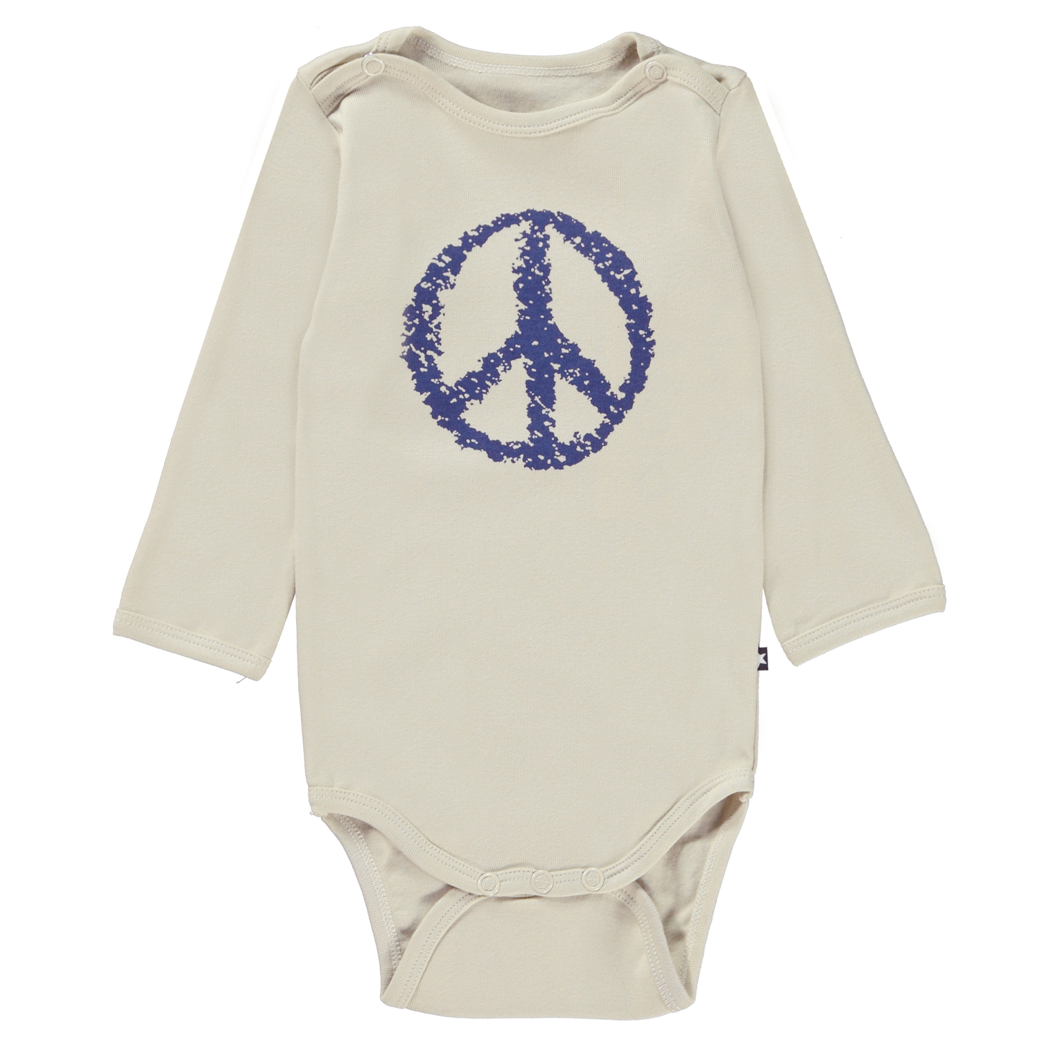 Foss ist ein beigefarbener Babybody mit einem großen Peace-Zeichen auf der Vorderseite. Foss hat Druckknöpfe im Kragen und zwischen den Beinen, die das An- und Ausziehen des Bodys erleichtern.