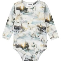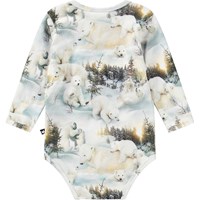 Langärmeliger Body aus Öko-Baumwolle. Der Body hat Druckknöpfe am Kragen und zwischen den Beinen, um das An- und Ausziehen zu erleichtern. Er hat einen Allover-Print von einer Gruppe von Eisbären, die im Schnee herumtollen und eine schöne Zeit haben.