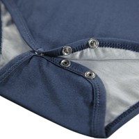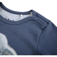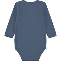 Dunkelblauer Langarm-Body für die Kleinen aus Öko-Baumwolle mit einem Aufdruck eines gehäkelten Babyelefanten. Der Body hat Bindebänder und Knopfverschluss an den Schultern und zwischen den Beinen für einfaches An- und Ausziehen.