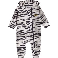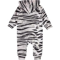 Fowo ist ein Babyanzug aus Öko-Baumwolle mit schwarz-weißem Tiger-Print. Der Anzug hat einen praktischen diagonalen Reißverschluss auf der Vorderseite sowie eine Kapuze und Rippbündchen an den Ärmel- und Beinabschlüssen.