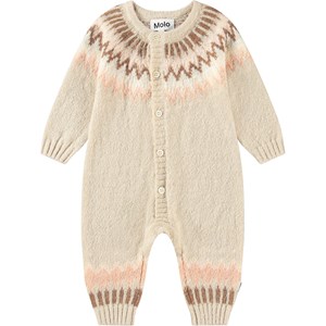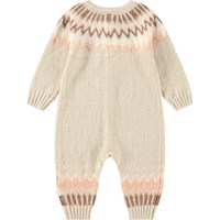 Beiger Overall aus weicher Alpakawollmischung. Der Overall hat lange Ärmel, lange Beine und eine Knopfleiste vorne. Mit einem schönen nordisch inspirierten Muster am Kragen und den Beinen. Perfekt für kalte Tage.