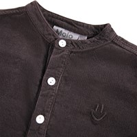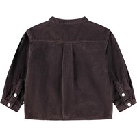 Dunkelbraunes Samtshirt für die Kleinen aus Öko-Baumwolle. Das Shirt hat einen Mandarin-Kragen und eine Knopfleiste mit drei weißen Knöpfen. Der lockere Schnitt macht es bequem zu tragen und einfach an- und auszuziehen. Auf der Brust ist ein kleines rosa lächelndes Gesicht gestickt. Kombinieren Sie es mit der passenden Hose oder Shorts für ein komplettes Outfit.