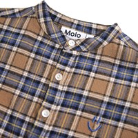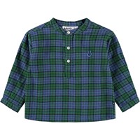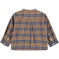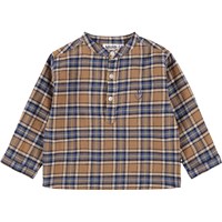 Braunes und blaues kariertes Shirt für die Kleinen aus Öko-Baumwolle. Das Hemd hat einen Mandarin-Kragen und eine Knopfleiste mit drei weißen Knöpfen. Der lockere Schnitt macht es bequem zu tragen und einfach an- und auszuziehen. Auf der Brust ist ein kleines blaues lächelndes Gesicht gestickt. Kombinieren Sie es mit der passenden Hose oder Shorts für ein komplettes Outfit.