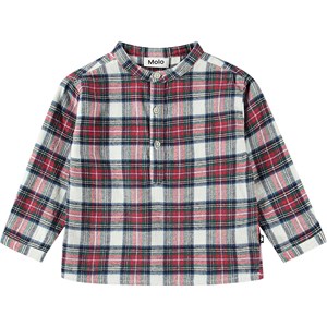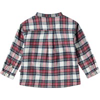 Rot-schwarz-weiß kariertes Hemd aus Öko-Baumwolle für die Kleinen. Das Hemd hat einen Mandarin-Kragen und eine Knopfleiste mit drei weißen Knöpfen. Es hat eine lockere Passform, was es bequem zu tragen und einfach anzuziehen macht.