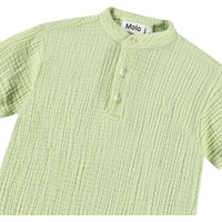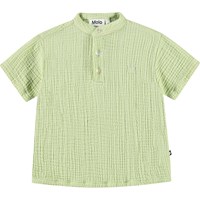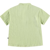 Kurzarmhemd für die Kleinen aus Öko-Kräuselbaumwolle. Das Hemd hat einen Mandarin-Kragen und eine Knopfleiste mit drei weißen Knöpfen. Es hat eine lockere Passform, die es bequem zu tragen und einfach anzuziehen macht. Das Hemd ist hellgrün mit einem kleinen gestickten lächelnden Gesicht auf der Brust. Kombinieren Sie es mit der passenden Hose für ein komplettes Outfit.