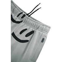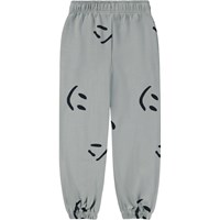 Graue Jogginghose aus Öko-Baumwolle mit elastischem Bund, innenliegendem Kordelzug, elastischen Bündchen an den Knöcheln und Seitentaschen. Die Jogginghose hat eine normale Passform und einen schwarzen Aufdruck lächelnder Gesichter.