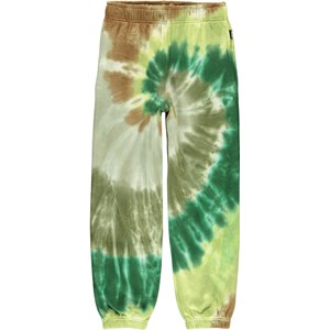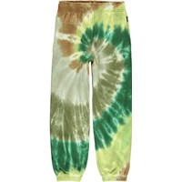 Adan ist eine Unisex-Jogginghose mit grün-braunem Batikdruck, der sich spiralförmig windet. Die Hose hat einen Gummizug am Knöchel und in der Taille sowie Vordertaschen und eine einzelne aufgenähte Gesäßtasche.