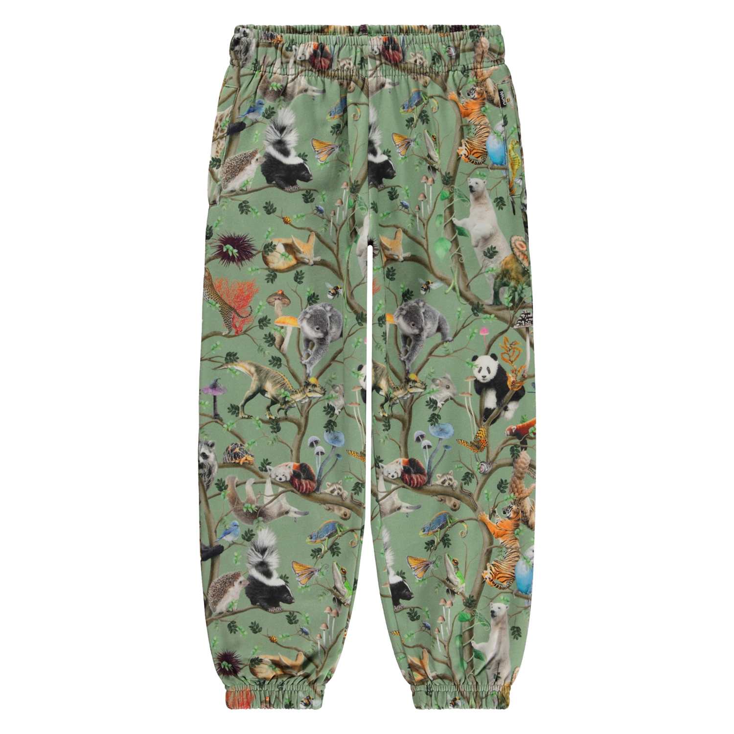 Grüne Jogginghose mit Allover-Print. Der Druck zeigt alle Arten von Tieren im Baum des Lebens. Sie erzählen die Geschichte, wie wir alle auf der Welt miteinander verbunden sind. Wie die Wurzeln von Bäumen sind Pilze und Vögel, Bäume und Bären, groß und klein, miteinander verbunden sind, und dass wir uns alle umeinander kümmern mussen. Diese Hose besteht aus 100% Baumwolle, hat einen Gummizug und einen Innenbund in der Taille, einen Gummizug an den Knöcheln, Seitentaschen und eine Hintertasche. Die Hose hat eine normale Passform.
