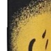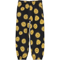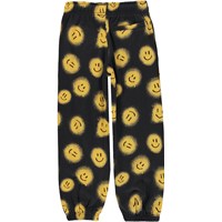 Adan ist eine schwarze Unisex-Jogginghose mit Aufdrucken von gelben Smileys. Die Hose hat einen Gummizug am Knöchel und in der Taille sowie Vordertaschen und eine einzelne aufgenähte Gesäßtasche.