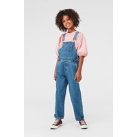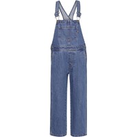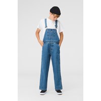 Aer ist eine Unisex-Jeanshose in Blau. Die Hose hat verstellbare Hosenträger sowie Knöpfe an der Seite und eine Tasche an der Vorderseite.