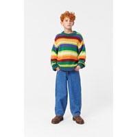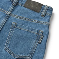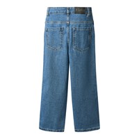 Blaue Jeans aus Öko-Baumwolle mit 5 Taschen, geradem Bein und Reißverschluss. Diese Hose ist von der Skater-Szene inspiriert und hat eine lockere Passform. Der Bund kann mit einem internen Gummizug angepasst werden, um eine perfekte Passform für alle Kinder zu gewährleisten. Größen 92-134 haben Druckknöpfe, die das An- und Ausziehen erleichtern, während Größen 140-176 einen regulären Jeansknopf haben.
