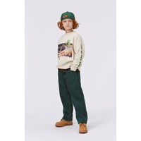 Dunkelgrüne Jeans mit schwarz/grünem Melange-Effekt. Diese Jeans sind aus 100% Baumwolle, haben lange Beine und eine lockere Passform. Die Taille der Hose kann mit einem internen verstellbaren Gummizug angepasst werden, sodass sie für alle Kinder perfekt passt. Die Größen 92-134 haben Druckknöpfe, sodass die Hose leicht an- und auszuziehen ist - die Größen 140-176 haben normale Jeansknöpfe.