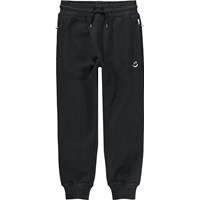 Schwarze Jogginghose aus weicher Öko-Baumwolle. Die Hose hat eine lockere Passform, Seitentaschen mit Reißverschluss sowie einen Bund mit breitem Gummizug und Kordelzug, wodurch sie gut sitzt und ein einfaches Anziehen ermöglicht. Die Hose hat einen festen Ripprand an den Beinen und einen kleinen Gesticktes Gesicht an der Tasche. Die Hose ist angenehm zu tragen und bietet viel Bewegungsfreiheit.