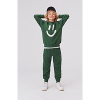Alvar ist eine sportliche Jogginghose in Grün mit einem Aufdruck eines kleinen Smileys auf einer Tasche vorne. Die Hose hat einen breiten, elastischen Bund und Reißverschlusstaschen.