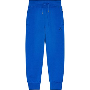 Blaue Jogginghose aus Öko-Baumwolle mit einem elastischen Bund und einer internen Kordel. Die Hose hat Reißverschlusstaschen und einen sicheren gerippten Bündchen an den Knöcheln. Sie hat eine normale Passform und ein kleines besticktes Gesicht an der Tasche. Die Hose hat eine gebürstete Innenseite, die sie weich und warm zu tragen macht.