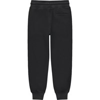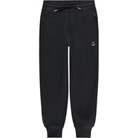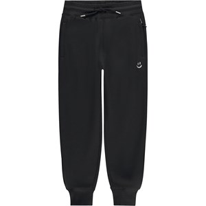 Schwarze Jogginghose mit kleiner Smile-Stickerei in Weiß auf der Vorderseite. Diese Hose besteht aus 100% Baumwolle, hat einen Gummizug und Bänder in der Taille, Rippbündchen an den Knöcheln, Seitentaschen mit verdeckten Reißverschlüssen und eine Hintertasche. Die Hose hat eine normale Passform.
