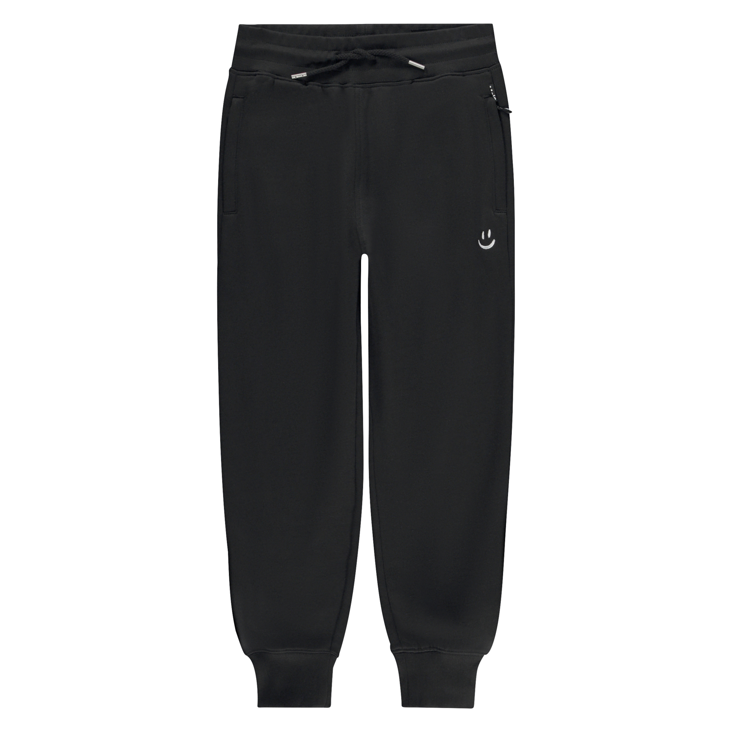 Schwarze Jogginghose mit kleiner Smile-Stickerei in Weiß auf der Vorderseite. Diese Hose besteht aus 100% Baumwolle, hat einen Gummizug und Bänder in der Taille, Rippbündchen an den Knöcheln, Seitentaschen mit verdeckten Reißverschlüssen und eine Hintertasche. Die Hose hat eine normale Passform.