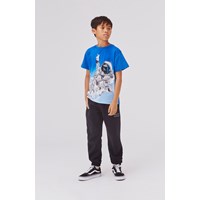 Am ist eine schwarze Unisex-Jogginghose mit Gummizug am Knöchel und an der Taille und einem Logo-Patch auf der linken Seite. Die Hose hat Vordertaschen und eine einzelne aufgesetzte Gesäßtasche.