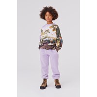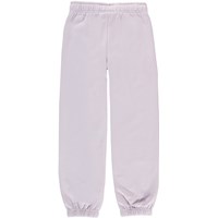 Am ist eine lila Unisex-Jogginghose mit Gummizug am Knöchel und in der Taille und einem Logo-Patch auf der linken Seite. Die Hose hat Vordertaschen und eine einzelne aufgesetzte Gesäßtasche.