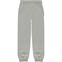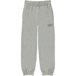 Am ist eine graue Unisex-Jogginghose mit Gummizug am Knöchel und in der Taille und einem Logo-Patch auf der linken Seite. Die Hose hat Vordertaschen und eine einzelne aufgesetzte Gesäßtasche.