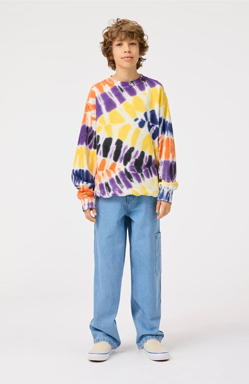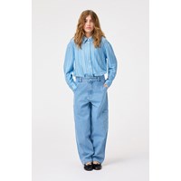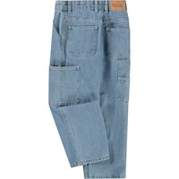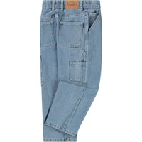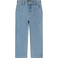 Blaue Baumwoll-Jeans mit Arbeitskleidungsdetails. Die Jeans sind praktisch und haben viele Taschen, sowohl an den Seiten entlang der Beine. Sie haben eine lockere Passform und können an der Taille mit einem internen Gummizug angepasst werden, damit sie perfekt für alle Kinder passen. Größen 92-134 haben Druckknöpfe für einfaches An- und Ausziehen, während Größen 140-176 einen regulären Jeansknopf haben.