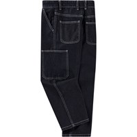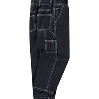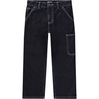 Dunkelblaue Baumwolljeans mit Taschen an den Seiten und hinten. Die Jeans haben kontrastierende Nähte und coole Arbeitskleidungsdetails, wie eine Tasche am Oberschenkel. Sie haben eine lockere Passform und können an der Taille mit einem internen Gummiband angepasst werden, damit sie perfekt an allen Kindern sitzen. Größen 92-134 haben Druckknöpfe für einfaches An- und Ausziehen, während Größen 140-176 einen regulären Jeansknopf haben.