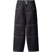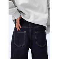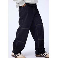 Dunkelblaue Oversize-Jeans aus Raw-Denim mit 5 Taschen, Gürtelschlaufen und hellen Nähten an den Knien. Die Jeans hat eine Oversize-Passform.