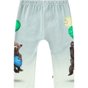 Hellblaue Öko-Baumwollhosen für die Kleinen mit lockerer Passform und elastischem Bund für einfache Bewegung. Die Hosen zeigen einen Druck von kleinen Bärenjungen, die mit bunten Luftballons spielen. Leicht anzuziehen und auszuziehen.