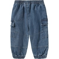 Blaue Cargo-Hosen für die Kleinen aus weichem Bio-Baumwoll-Chambray. Die Hosen haben eine lockere Passform und Cargotaschen an den Oberschenkeln. Sie haben auch einen elastischen Bund, der das An- und Ausziehen erleichtert, sowie einen elastischen Abschluss an den Knöcheln.