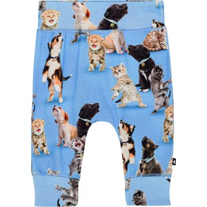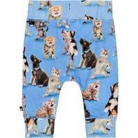 Blaue Babyhose aus Öko-Baumwolljersey mit Allover-Print aus süßen Hunden und Kätzchen. Die Hose hat breiten elastischen Ripp an der Taille und am Beinende sowie sichtbare Nähte vorne, die der Hose einen Jogginghosen-Look verleihen. Die Hose ist weich zu tragen und bietet viel Bewegungsfreiheit. Kombinieren Sie es mit dem passenden Shirt oder dem passenden Body und erhalten Sie ein komplettes Jersey-Set.