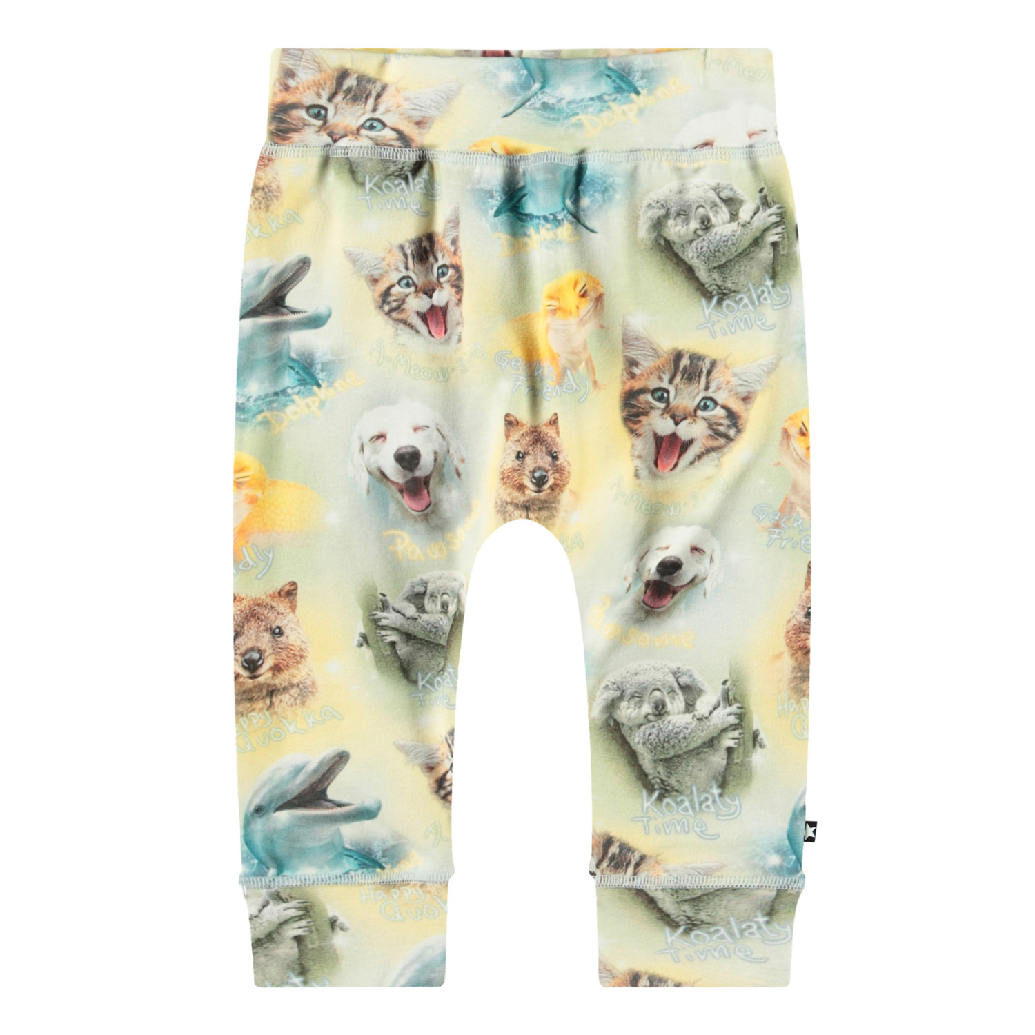 Hosen aus Öko-Baumwolljersey für die Kleinen. Die Hosen haben einen breiten elastischen Rippenbund und Bündchen sowie sichtbare Nähte auf der Vorderseite, die ihnen einen Hosen-Look verleihen. Sie sind angenehm zu tragen und bieten viel Bewegungsfreiheit. Die Hosen sind mit einem Allover-Print mit lächelnden Tieren versehen. Für ein komplettes Outfit kombinieren Sie sie mit einem passenden Body.