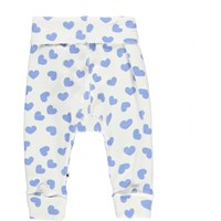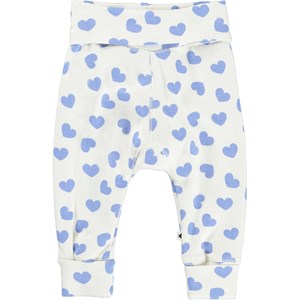 San ist eine weiche weiße Babyhose mit einem Aufdruck aus blauen Herzen. Die Hose hat einen breiten elastischen Bund und einen Beinabschluss, wo beide mit Umschlag sind. Mit passendem Oberteil kombinieren.