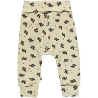 San ist eine weiche, hellgelbe Babyhose mit Aufdrucken von kleinen Eichhörnchen und Nüssen. Die Hose hat einen breiten elastischen Bund und einen Beinabschluss, wo beide mit Umschlag sind. Mit passendem Oberteil kombinieren.
