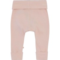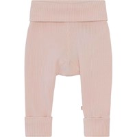 San ist eine hellrosa Öko-Babyhose. Kombinieren Sie mit passendem Oberteil. Die Hose hat einen breiten Gummibund und einen Beinabschluss, wo beides umgeschlagen ist.