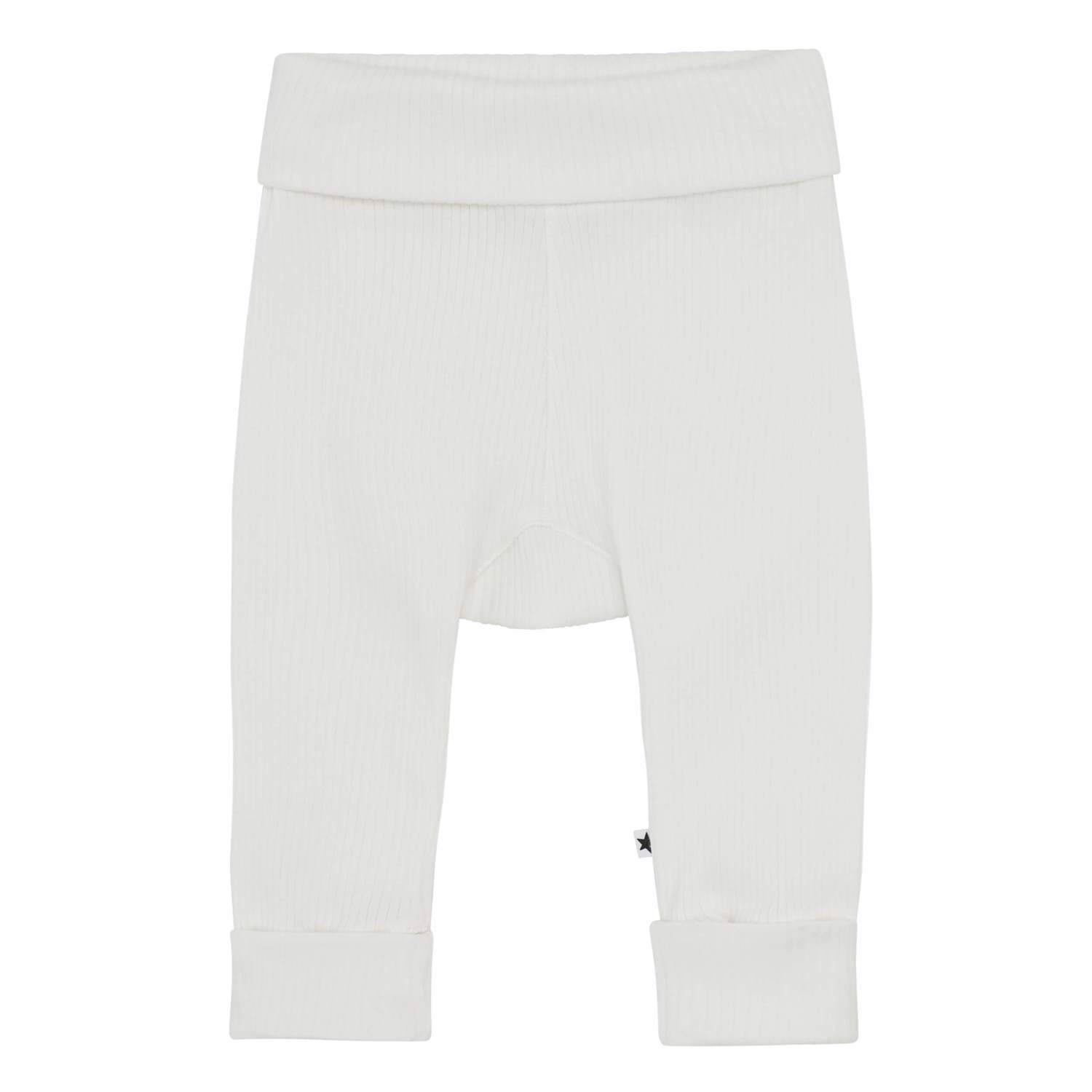 San ist eine weiße Öko-Babyhose. Die Hose hat einen breiten Gummibund und einen Beinabschluss, wo beides umgeschlagen ist.