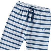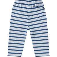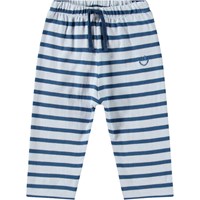 Öko-Baumwollhosen für die Kleinen. Die Hosen haben eine lockere Passform mit einem elastischen Bund und einer Kordel, die das An- und Ausziehen erleichtern. Sie sind gestreift in Blautönen mit einem blau bestickten lächelnden Gesicht, das zur Kordel passt. Kombinieren Sie sie mit einem passenden Oberteil für ein komplettes Outfit.