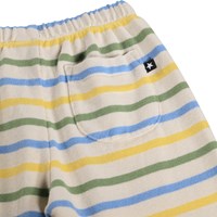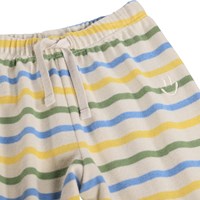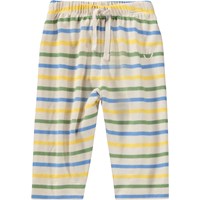 Weiche Hosen für die Kleinen aus Bio-Baumwolle mit blauen, grünen und gelben Streifen. Sie haben eine lockere Passform sowie einen elastischen Bund und eine Kordel, die das An- und Ausziehen erleichtern und sie bequem zu tragen machen.