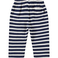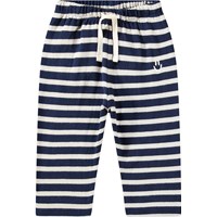 Gestreifte blaue und off-weiße Jogginghose aus Öko-Baumwolle für die Kleinen. Die Hose hat eine lockere Passform und einen elastischen Bund mit Kordelzug, was das An- und Ausziehen erleichtert und Bewegungsfreiheit ermöglicht. Auf der Vorderseite ist ein kleines hellblaues lächelndes Gesicht gestickt, das zum Kordelzug passt. Diese Hose kann auch als komplettes Set mit passender Bluse erworben werden.