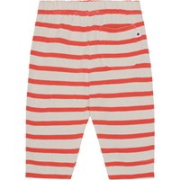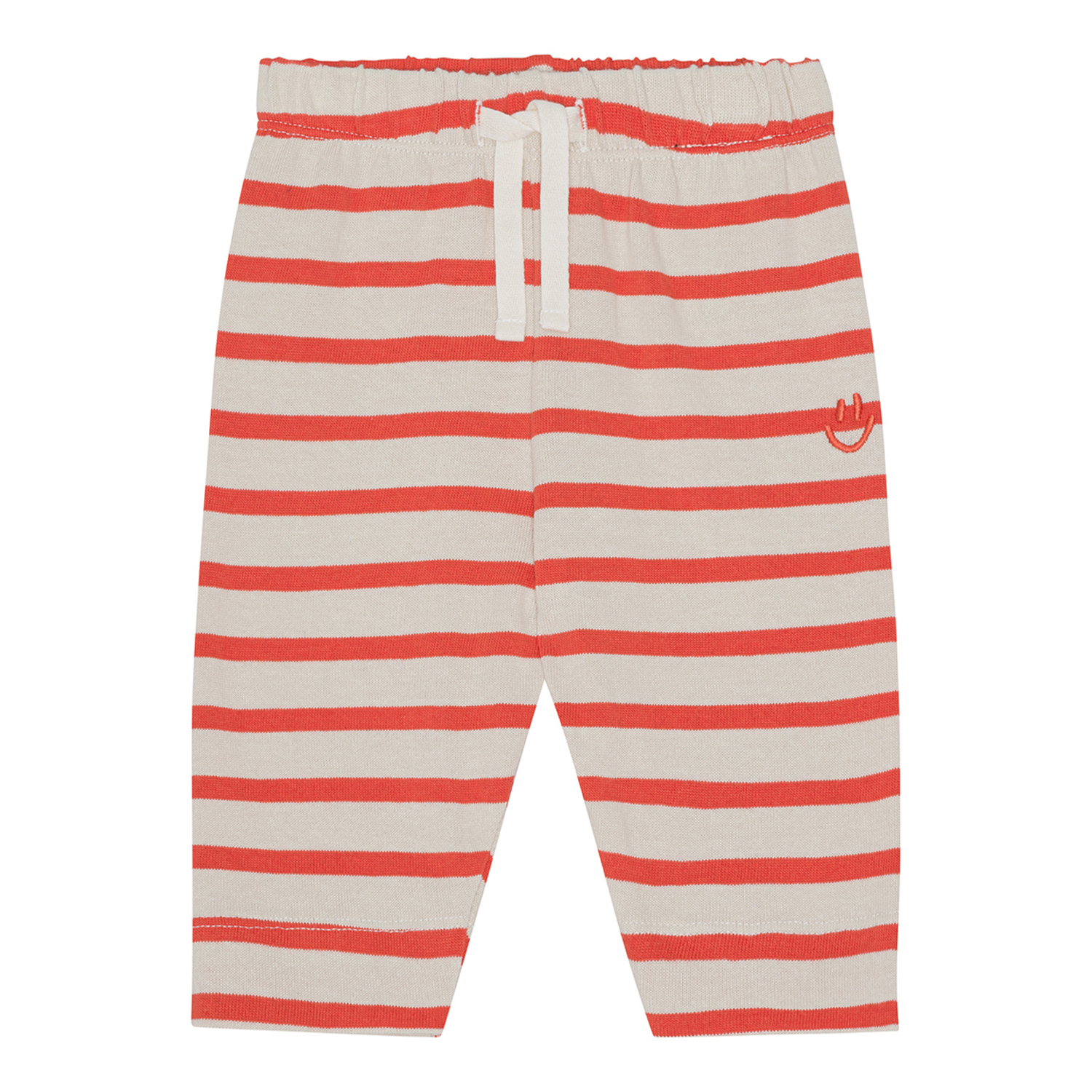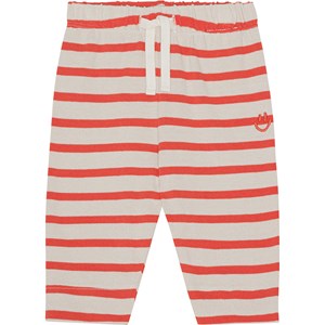 Gestreifte Jogginghose in Rot und Sand für die Kleinen aus Öko-Baumwolle. Die Hose hat eine lockere Passform, einen Gummizug und Bänder in der Taille, die das An- und Ausziehen erleichtern und Bewegungsfreiheit bieten. Auf der Vorderseite der Hose ist ein kleiner roter Smiley aufgestickt. Kombinieren Sie die Hose mit einer passenden Bluse oder einem T-Shirt und erhalten Sie ein weiches Sweat-Set.
