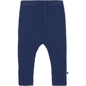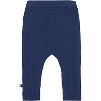 Shadow ist eine gestrickte Babyhose in blauer Rippqualität. Die Hose hat Bänder in der Taille und Falten an der Unterseite der Beine. Kombinieren Sie die Hose mit der passenden Bluse.