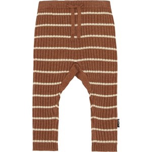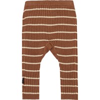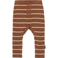 Sigmund ist eine gestrickte Ripp-Babyhose in Braun mit schmalen weißen Streifen. Die Hose hat einen Bund in der Taille und kann an den Beinen gefaltet werden.