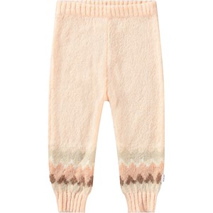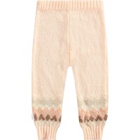 Rosa gestrickte Hosen aus weicher Wollmischung für die Kleinen. Die Hosen haben ein nordisch inspiriertes Muster an den Beinen und Rippbündchen an der Taille und den Beinen.