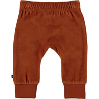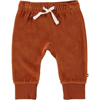 Sigo ist eine braune Babyhose aus Velours mit lockerer Passform und weißem Bindeband in der Taille.