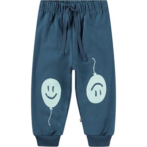 Blaue Jogginghosen für die Kleinen aus Öko-Baumwolle mit einer gebürsteten Innenseite, die sie weich und warm zum Tragen macht. Die Hosen haben einen elastischen Bund und Kordelzug sowie gerippte Bündchen an den Knöcheln. Sie sind leicht an- und auszuziehen, bieten viel Bewegungsfreiheit und haben hellblaue Ballons auf den Knien gedruckt.